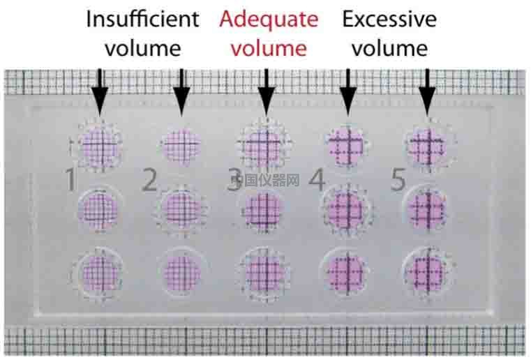 怎么知道加了合適體積的Matrigel: 由于Matrigel流動性不強,并且有可能移液槍不準確,有可能10μl的膠不能填滿ibidi血管生成載玻片的下孔,這樣,必然會影響到實驗的成像結果。這時用一張格子紙就能知道移液槍調整到多少能正好把下孔填滿。