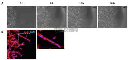 圖一:MDA-MB-231細胞在環形細胞侵襲過程中形成了侵襲鏈:A)MDA-MB-231細胞在matrigel中形成了一個長的侵襲鏈 B)勤洗臉的免疫熒光圖,紅色為Actin,藍色為細胞核 2. 使用環形侵襲實驗能夠記錄對比侵襲速率和侵襲面積(圖二)